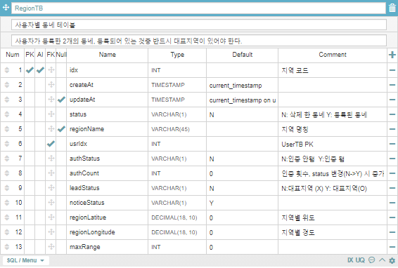 당근마켓에서 지역 같은 경우에는 유저별 동네가 2개까지 등록할 수 있으며, 2개의 설정된 지역 중 대표지역을 설정할 수 있습니다. 동네 같은 경우는 지역명, 위도, 경도 컬럼으로 나눴으며, 대표지역은 별도의 Flag를 통해 판단할 수 있도록 했습니다. 그리고 선택 범위는 maxRange 컬럼을 넣었습니다.