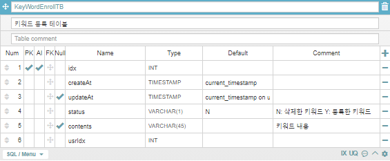 유저별 키워드를 등록할 수 있도록 설계하였고, 알림 받을 동네를 설정하는 것은 RegionTB에 leadStatus라는 Flag를 두었습니다.