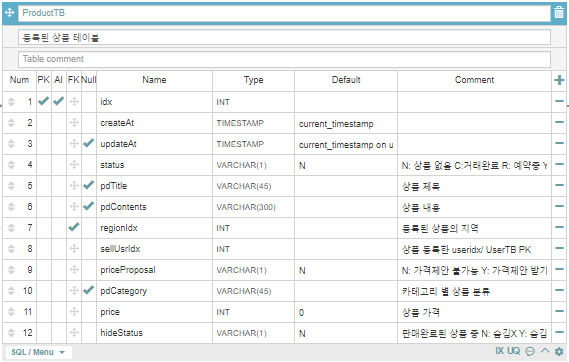 그리고 채팅 방은 중고품 기준으로 생성되기 때문에 상품의 index 값을 채팅 방 Table에 별도의 컬럼을 두었습니다.