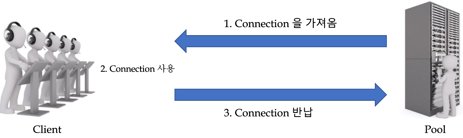 어플리케이션이 실행되면 DB와 연결 된 Connection 객체를 미리 Pool에 생성해놓고 가져와 사용하고 반납하는 방식입니다.